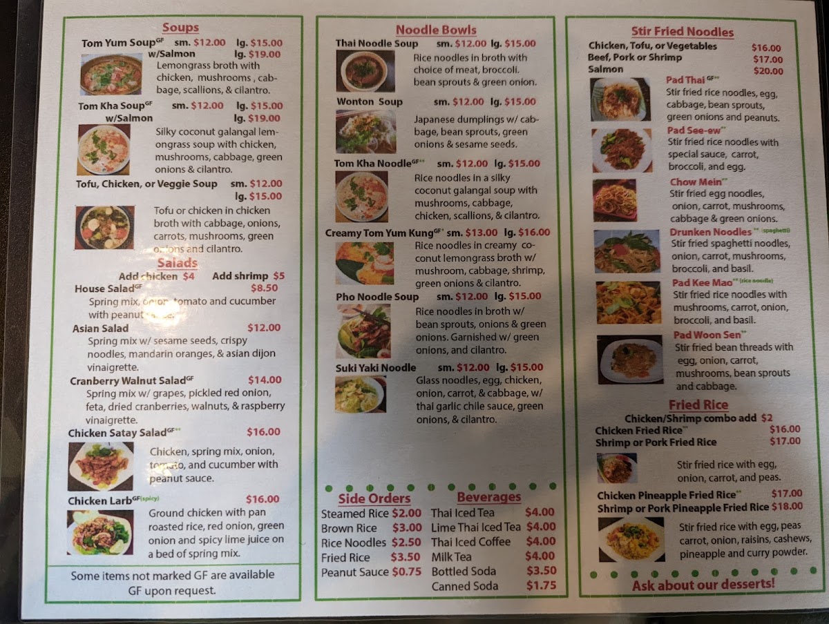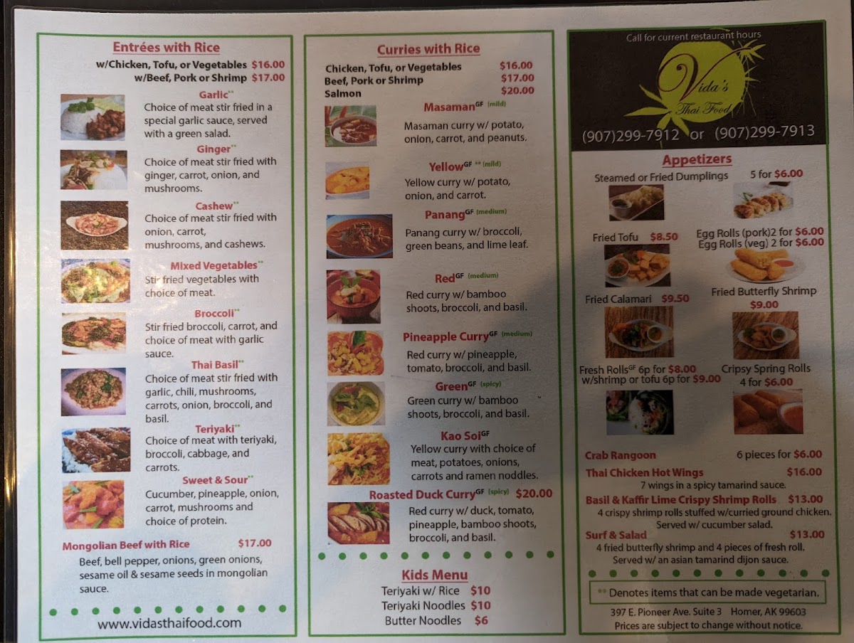 Welcome to Vida's Thai Food, a gem nestled in the heart of Homer, Alaska. Known for its delightful atmosphere and warm service, this eatery offers an array of authentic Thai dishes that cater to every palate. Visitors rave about the Pad Thai, which stands out for its perfect balance of flavors and fresh ingredients. The Larb Moo captivates with its aromatic spices, while the Yellow and Panang Curries deliver rich, flavorful experiences that leave diners raving. The sweet endings, like sweet pumpkin in coconut milk, provide a comforting close to your meal. Guests appreciate the convenience of dining in or taking out, with quick service and satisfied smiles all around. Whether you're craving savory curries or refreshing fresh rolls, Vida's is a must-visit for Thai food lovers. Ample parking and a spacious dining area further enhance the experience, making it a perfect spot for any occasion.